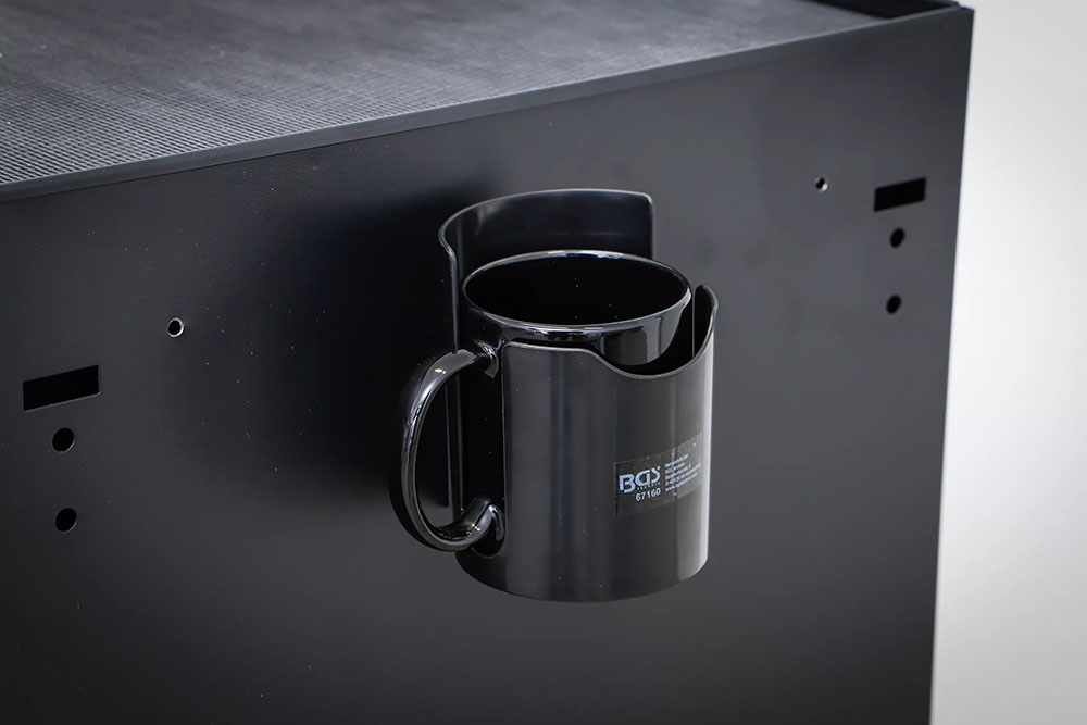 Choć z nazwy to „uchwyt na kubek”, w praktyce sprawdza się znacznie szerzej. Pozwala bezpiecznie odstawić napoje oraz inne przedmioty o okrągłym przekroju – takie jak puszki z farbą, aerozole czy niewielkie pojemniki techniczne - z dala od narzędzi i elementów roboczych.