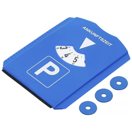 - Dysk parkingowy ze skrobaczką do lodu i gumową krawędzią. Umożliwia ustawienie czasu przyjazdu, a dodatkowe żetony ułatwiają korzystanie z wózków sklepowych.
