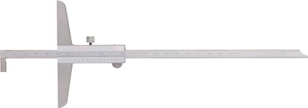 Wykonanie: ze stali nierdzewnej, hartowanej, noniusz chromowany matowo i obustronnie bardzo dokładnie wyskalowany laserowo, dwustronna podziałka szyny pomiarowej, dzięki temu może być użytkowany jako normalny głębokościomierz, ze śrubą ustalającą. Dostawa w kasecie z tworzywa sztucznego.