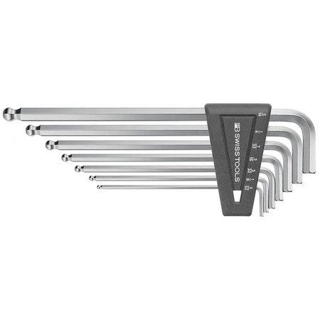 Wykonanie: DIN 911 L, ISO 2936 L. Z wysokostopowej stali sprężynowej hartowanej na wskroś, chromowanej. Z końcówką kulistą i fazowanym krótkim ramieniem. Dostawa w uchwycie.