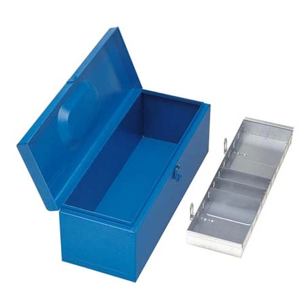 - Skrzynka narzędziowa JUMBO (340x841x427 mm) z blachy stalowej, odporna na wilgoć. Posiada uchwyty, blokadę pokrywy oraz wnętrze z wyściółką i wkładką na drobne części.