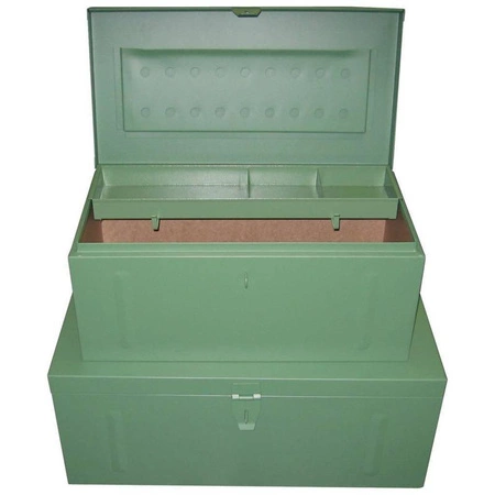- Stabilna, metalowa skrzynka narzędziowa odporna na warunki atmosferyczne w zielonym kolorze. Wnętrze wyłożone jest twardą płytą pilśniową i wyposażone w wyjmowaną wkładkę na drobne elementy. Można ją zamknąć na kłódkę. Wymiary: 830 x 440 x 340 cm