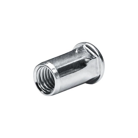 - Sześciokątna stalowa nitonakrętka M6 z łbem płasko-okrągłym. Zakres 0,5-3 mm, otwór 9,1 mm. Wysoka odporność na drgania i ścinanie, czyste wykończenie.