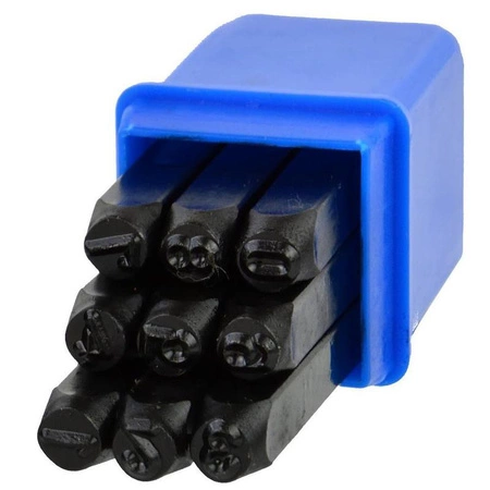 - Numeratory do wybijania cyfr 5 mm ze stali węglowej w zestawie 9 sztuk. Trwałe i precyzyjne, zapakowane w praktyczne etui z tworzywa.