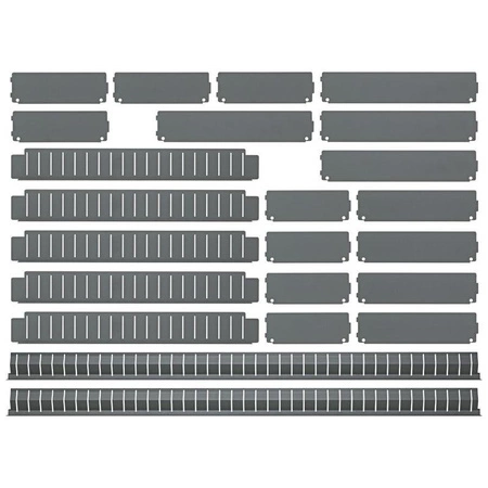 Wykonanie: 23-częściowy zestaw do podziału szuflad wózków warsztatowych i stołów warsztatowych na kółkach o wymiarach szuflady 753 x 397 mm