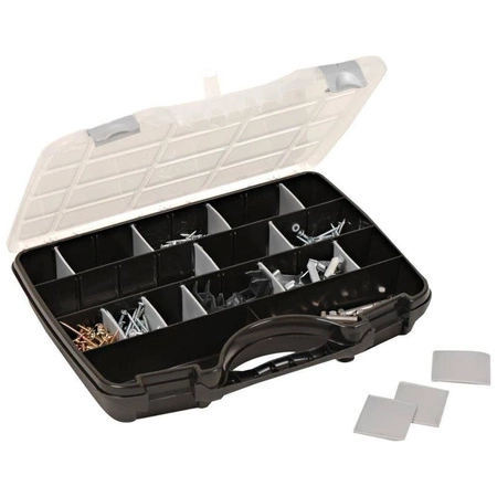 - Walizka narzędziowa z możliwością indywidualnej konfiguracji dzięki 21 przegródkom. Obudowa z wytrzymałego polipropylenu, zintegrowany uchwyt i przezroczysta pokrywa ułatwiają organizację. Skrzynka sprzedawana bez zawartości.