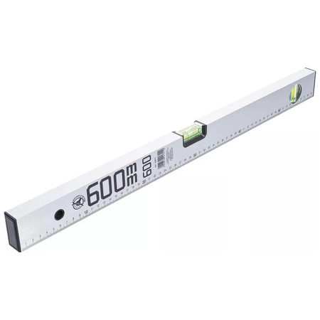 - Poziomnica 600 mm z frezowanym spodem zapewniającym wysoką dokładność pomiarów. Wyposażona w libellę pionową i poziomą, a jej lakierowany aluminiowy korpus w profilu prostokątnym gwarantuje trwałość. Posiada otwór do zawieszania.