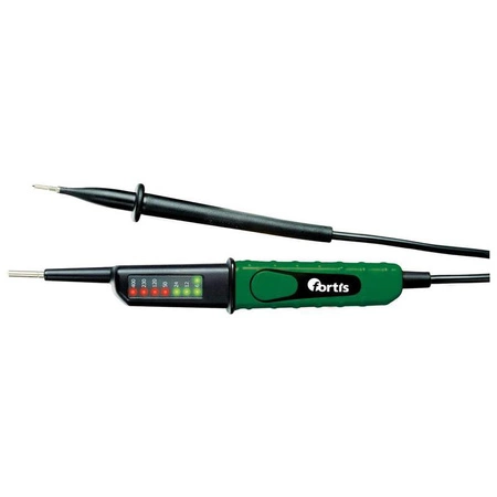 Wykonanie: dwubiegunowy próbnik napięcia z sygnalizacją wizualną i akustyczną. Wskaźnik LED napięcia i polaryzacji, działa bez baterii. Dostarczany z nakręcanymi tulejkami kontaktowymi do gniazdek.