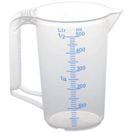 - Dzbanek 0,5 l z przezroczystego PP z podwójną skalą co 10 ml. Ergonomiczny uchwyt, odporność chemiczna i termiczna, BPA-free, do zmywarki i mikrofali.