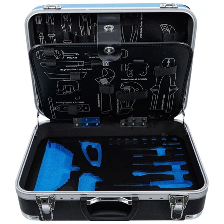- Pusta walizka z tworzywa ABS do BGS 15504. Ochronne narożniki i powlekane płyty MDF zapewniają trwałość i bezpieczeństwo przechowywanych narzędzi.