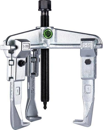 Wykonanie: Ze ślizgowymi, samocentrującymi, zawsze równoległymi przekładanymi ramionami do ściągacza ze stali narzędziowej z domieszką chromu. Z automatyczną regulacją chwytaków oraz ulepszanym cieplnie i specjalnie powlekanym wrzecionem dociskowym o bardzo dobrych właściwościach ślizgowych. Solidny, mocny model.