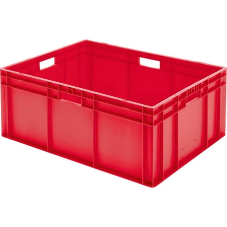 - Skrzynka transportowa marki LA-KA-PE 800 x 600 x 320 mm, czerwona, z pełnymi ściankami i dnem. Wykonana z polipropylenu, dopuszczona do kontaktu z żywnością. Pasuje na palety 1200 x 800 mm, idealna na przenośniki rolkowe, wyposażona w otwory na uchwyty.
