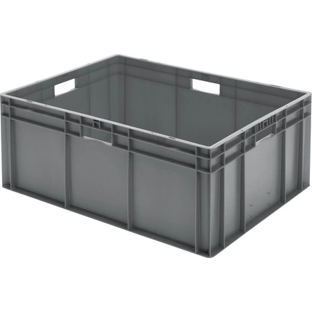 - Skrzynka transportowa marki LA-KA-PE 800 x 600 x 320 mm, szara, z pełnymi ściankami i dnem. Wykonana z polipropylenu, dopuszczona do kontaktu z żywnością. Pasuje na palety 1200 x 800 mm, idealna na przenośniki rolkowe, wyposażona w otwory na uchwyty.