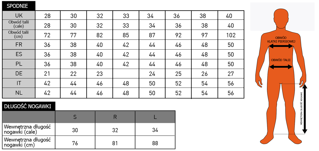Przy wyborze spodni zalecamy zmierzyć obwód w talii – w najwęższym miejscu, najlepiej na wysokości naturalnej linii talii. Pomiaru należy dokonać na cienką bieliznę, bez dodatkowych warstw odzieży, aby uzyskać najbardziej precyzyjny wynik.