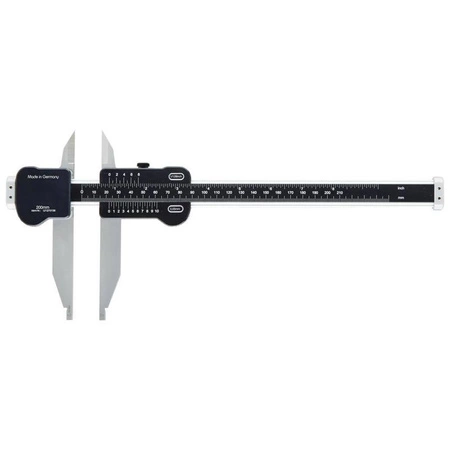 Wykonanie: hartowana, powierzchnie pomiarowe drobno szlifowane, wymienne szczęki pomiarowe. Suwak i szyna z aluminium, ze śrubą ustalającą i górnymi szczękami pomiarowymi. Optymalne prowadzenie i właściwości ślizgowe dzięki podwójnej prowadnicy pryzmowej.