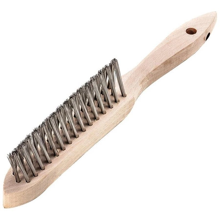 - Szczotka do spoin pachwinowych z nierdzewnym drutem V4A Ø 0,3 mm. Trzyrzędowa, z drewnianą rękojeścią – do delikatnego czyszczenia narożników i aluminium.