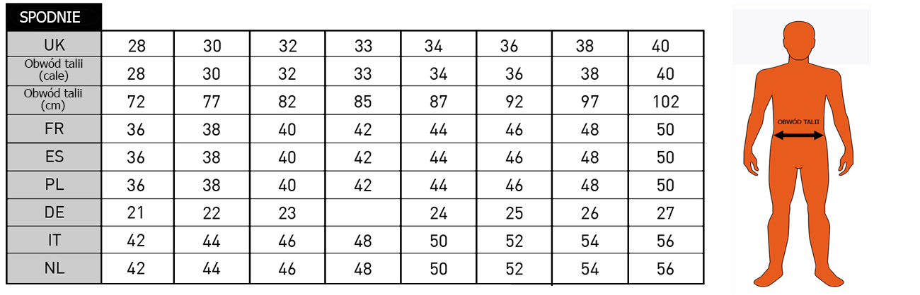 Przy wyborze spodenek zalecamy zmierzyć obwód w talii – w najwęższym miejscu, najlepiej na wysokości naturalnej linii talii. Pomiaru należy dokonać na cienką bieliznę, bez dodatkowych warstw odzieży, aby uzyskać najbardziej precyzyjny wynik.