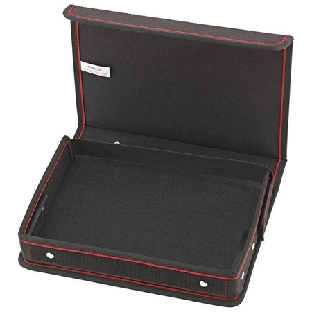 - Teczka narzędziowa 286×204×57 mm z nylonu 600D. Pokrywa na rzep, metalowe wsporniki, pasek zabezpieczający moduł piankowy.
