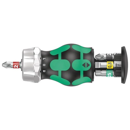 Wykonanie: z magnesem trwałym i funkcją grzechotki z drobnym uzębieniem zapewniającym mały kąt powrotu zapadki. Obrotowy magazynek na bity do łatwego i szybkiego wyjmowania bitów.