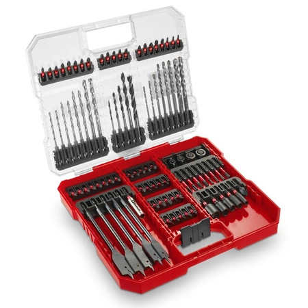 Zestaw XL-CASE 95 elementów marki Einhell to kompletny, profesjonalny zestaw akcesoriów przeznaczony do szerokiego zakresu prac montażowych i instalacyjnych. Sprawdzi się zarówno w warsztacie, jak i w zastosowaniach domowych. Zawiera wiertła do betonu, metalu i drewna, a także komplet bitów udarowych o różnych długościach, nasadki sześciokątne, uchwyt magnetyczny, pogłębiacz i ograniczniki głębokości wiercenia. Wszystkie elementy umieszczono w solidnej walizce Einhell XL-CASE z mechanizmem auto-lock i przezroczystą pokrywą.