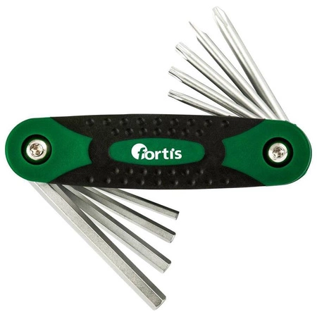 - Zestaw kluczy imbusowych marki FORTIS w wygodnym uchwycie scyzorkowym. W zestawie klucze z końcówką sześciokątną, płaską, krzyżową PH oraz TORX®.