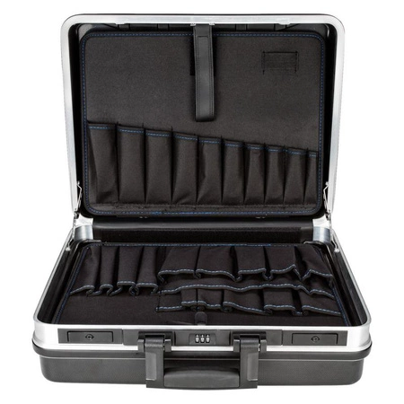 - Walizka ABS z ramą aluminiową i zabezpieczeniami. Umożliwia organizację narzędzi i dokumentów A4, wyposażona w uchwyt bezpieczeństwa.