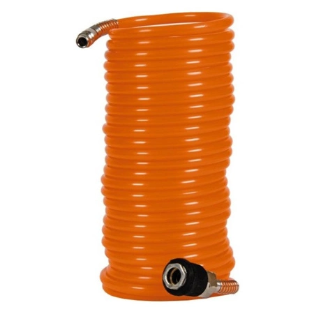 - Wąż pneumatyczny spiralny 8 m Ø 6 mm z szybkozłączką i nyplem. Elastyczny PU zapobiega plątaniu, a ciśnienie robocze do 10 bar zapewnia pewną pracę z narzędziami.