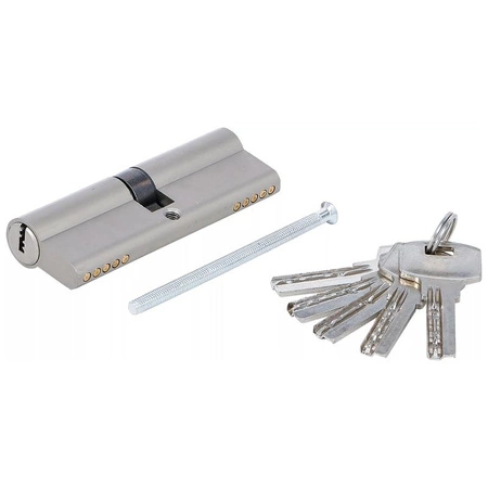 - Trwała wkładka 45/45 mm, długość 90 mm. Obudowa chromowana, mosiężny rdzeń, 5 kluczy w zestawie. Do drzwi o wyższym standardzie zabezpieczeń.