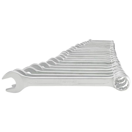- Zestaw 11 kluczy płasko-oczkowych 5,5–36 mm, DIN 3113A. Kute ze stali Cr-V, chromowane matowo, oczko 15°, dostawa w kartonowym pudełku.
