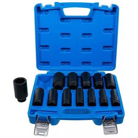 - Zestaw 13 głębokich nasadek udarowych calowych, rozmiary 7/16"-1 1/4", mocowanie 12,5 mm (1/2"), w walizce.