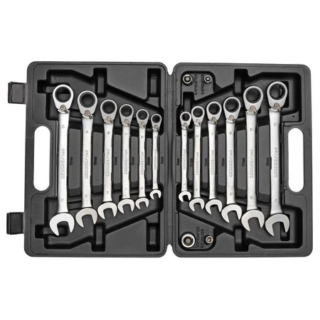 Zestaw kluczy płasko-oczkowych GEDORE RED R07203016 obejmuje rozmiary od 8 do 19 mm i został zaprojektowany do szybkiego, wygodnego odkręcania i dokręcania połączeń śrubowych. Każdy klucz wyposażono w przełączalny mechanizm grzechotkowy z 72 zębami, umożliwiający pracę z minimalnym kątem powrotu 5°. Główka oczkowa i szczękowa ustawione są pod kątem 15°, co poprawia dostęp do trudno dostępnych miejsc. Wykonanie z wytrzymałej stali chromowo-wanadowej z matowo-satynowanym wykończeniem zapewnia trwałość i odporność na korozję. Całość umieszczono w solidnym kufrze z tworzywa, ułatwiającym przechowywanie i transport.
