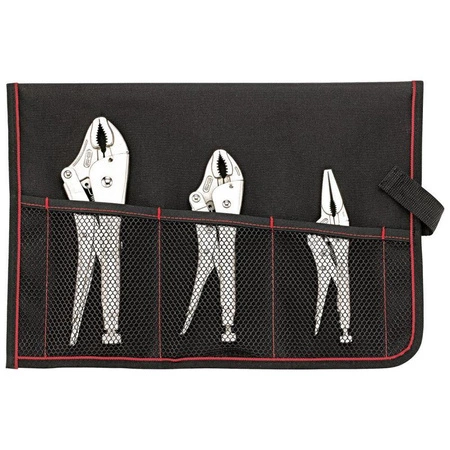 • Zestaw 3 szczypiec zaciskowych w zwijanym etui. 2 modele z wygiętymi szczękami 175/250 mm i 1 z wydłużonymi szczękami 150 mm. Stal Cr-V/Cr-Mo, niklowane.