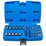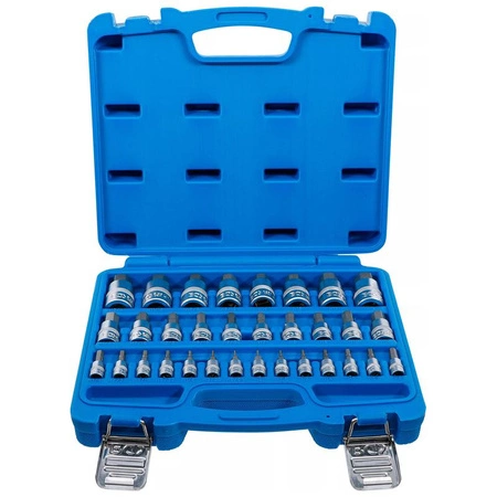 - Zestaw 32 nasadek do bitów, metrycznych i calowych, z gniazdem sześciokątnym 2-19 mm / 1/4 - 9/16". Pasuje do napędów 6,3 mm (1/4"), 10 mm (3/8"), 12,5 mm (1/2"). Ułożone w plastikowej walizce dla łatwego przechowywania.