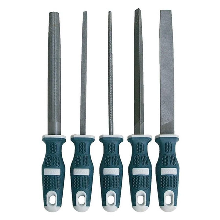 - Zestaw 5 pilników 200 mm o twardości 62-68 HRC: płaski, półokrągły, okrągły, trójkątny i kwadratowy. Do precyzyjnej obróbki i wykańczania krawędzi.