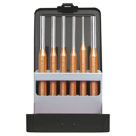 - Zestaw 6 wybijaków Ø 3–8 mm w metalowej kasecie. Stal Cr-V hartowana i odpuszczana, zgodna z DIN 6450, lakierowana na miedziano i srebrno.