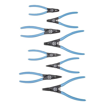 Gedore 1101-001 to rozbudowany zestaw 8 profesjonalnych szczypiec przeznaczonych do montażu i demontażu wewnętrznych i zewnętrznych pierścieni osadczych. Zawiera modele ze szczękami prostymi oraz zagiętymi pod kątem 90°, dzięki czemu idealnie sprawdza się w trudno dostępnych miejscach.