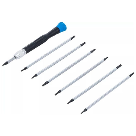 - Zestaw 8 precyzyjnych wkrętaków dla elektroników z 7 wymiennymi, podwójnymi trzpieniami i obrotowymi nasadkami. Idealny do pracy z drobnymi elementami elektronicznymi. W zestawie różnorodne końcówki Torx i krzyżakowe.