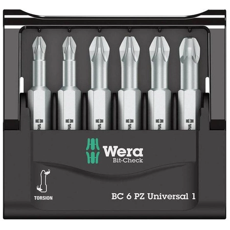- Zestaw 6 bitów krzyżakowych Pozidriv PZ1, PZ2, PZ3 marki Wera w praktycznej kasecie. Końcówki wkrętakowe Torsion posiadają strefę skrętną, która absorbuje energię kinetyczną powstającą podczas obciążeń szczytowych. Zapobiega to szybkiemu zużyciu narzędzi.