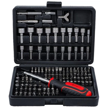 - Zestaw bitów uniwersalnych 6,3 mm (1/4") 122 szt. zawiera różne bity, w tym do gwintów, Torx, płaskie i krzyżakowe. Umożliwia precyzyjną pracę w wielu aplikacjach, dzięki różnorodności bitów i akcesoriów, jak uchwyt czy adapter.