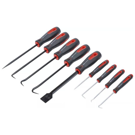 - Zestaw 9 igieł i haków z ergonomicznymi uchwytami. W komplecie różne kształty i długości, w tym hak wygięty, hak 45° i skrobak 23 mm.