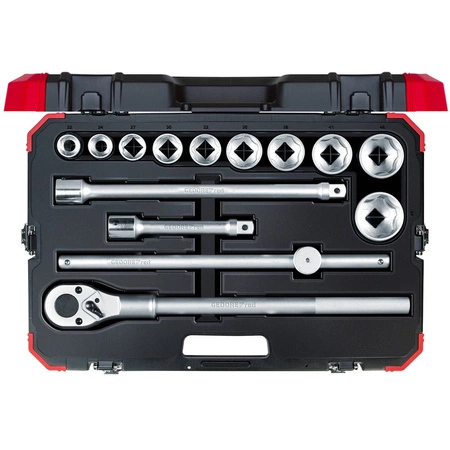 Zestaw kluczy nasadowych 3/4", 14 elementów - grzechotka dwukierunkowa 510 mm, nasadki 6-kątnane 22-50 mm, przedłużki, klucz krzyżowy z przesuwanym uchwytem, w plastikowym kufrze, GEDORE RED, R78004014