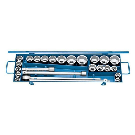 - Zestaw kluczy nasadowych 3/4" UD-Profil (25 elementów) z dźwigniową grzechotką i akcesoriami, Gedore D 32 EMAU-2. Zestaw zawiera nasadki UD-Profil 12-punktowe, grzechotkę dźwigniową oraz akcesoria, zapakowane w niebieską kasetę 660 x 230 x 80 mm.
