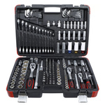 Wykonanie: Narzędzia ze stali chromowo-wanadowej, chromowane matowo, końcówki wymienne klucza nasadowego radełkowane, gniazda sześcio- i czworokątne o zaokrąglonych narożnikach do ochrony gniazda napędowego i łba śruby. Grzechotki dwukierunkowe z przełącznikiem dźwigniowym, 72 zęby, kąt powrotu 5°, z rękojeścią Kraftkant®. Dostawa w wytrzymałej, czerwono-czarnej kasecie z tworzywa sztucznego, ze schematem rozmieszczenia narzędzi w pokrywie. Narzędzia są umieszczone w 2-kolorowym wkładzie piankowym, gdzie miejsca po brakujących narzędziach są dobrze widoczne.