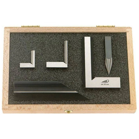 Wykonanie: kątownik według DIN 875/00, hartowany. Liniał krawędziowy według DIN 874/00, stal zwykła, oksydowana bezodblaskowo. Dostawa w kasecie drewnianej.