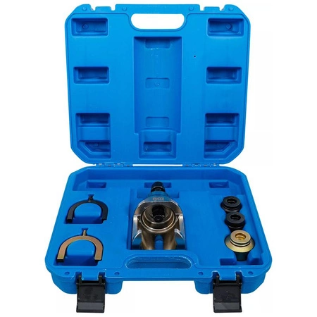 - Zestaw narzędzi do przegubu wahacza dla VW T4, BGS 8231 – do montażu i demontażu górnych przegubów wahacza w modelach VW T4, z adapterami dociskowymi.