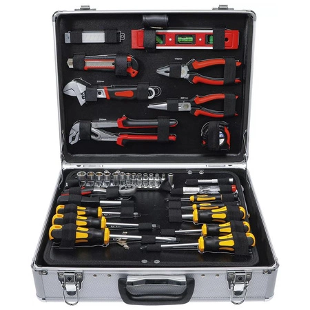 - Zestaw narzędzi w walizce aluminiowej, zawierający 129 elementów, to kompleksowe wyposażenie do prac mechanicznych i domowych. W skład wchodzą m.in. klucz nastawny, wkrętaki, nasadki, bity, kombinerki, piła kabłąkowa oraz młotek.