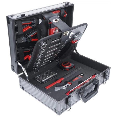 • Zestaw narzędzi BGS DIY 6057, 66 szt. w aluminiowej walizce. Zawiera m.in. wiertła HSS, szczypce, wkrętaki, klucze, bity, taśmę mierniczą, młotek oraz poziomnicę magnetyczną. Wygodna wkładka EVA i otwierane dno ułatwiają przechowywanie.