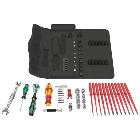 - Zestaw Wera Kraftform Kompakt W 2, 35 elementów w etui. Grzechotka Zyklop Speed 1/4", klucz Joker 6002, nasadki 5,5–13 mm, bity i trzpienie VDE dla wszechstronnych prac serwisowych.