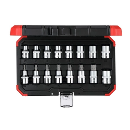 - Zestaw Torx 1/2", 16 el.: E10–E24 + T30–T70. Stal Cr-V, chrom mat, blokada kulkowa; solidna walizka z metalowymi zawiasami.