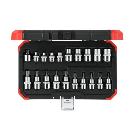 - Kompletny zestaw Torx: nasadki i bity w rozmiarach od E6 do E20 oraz T10 do T55